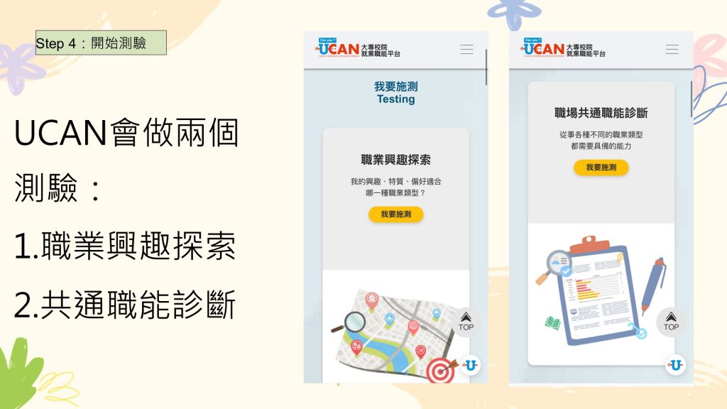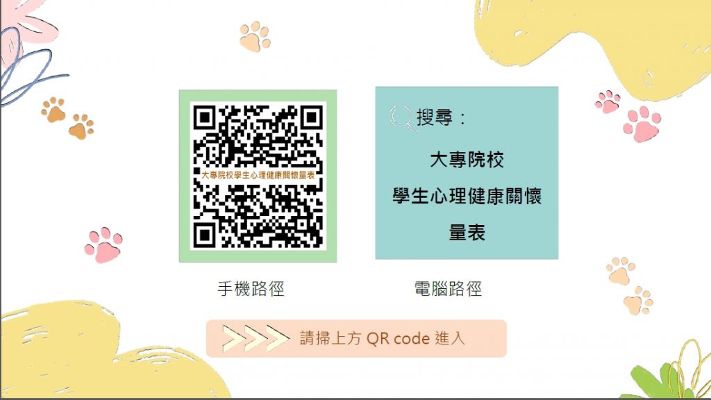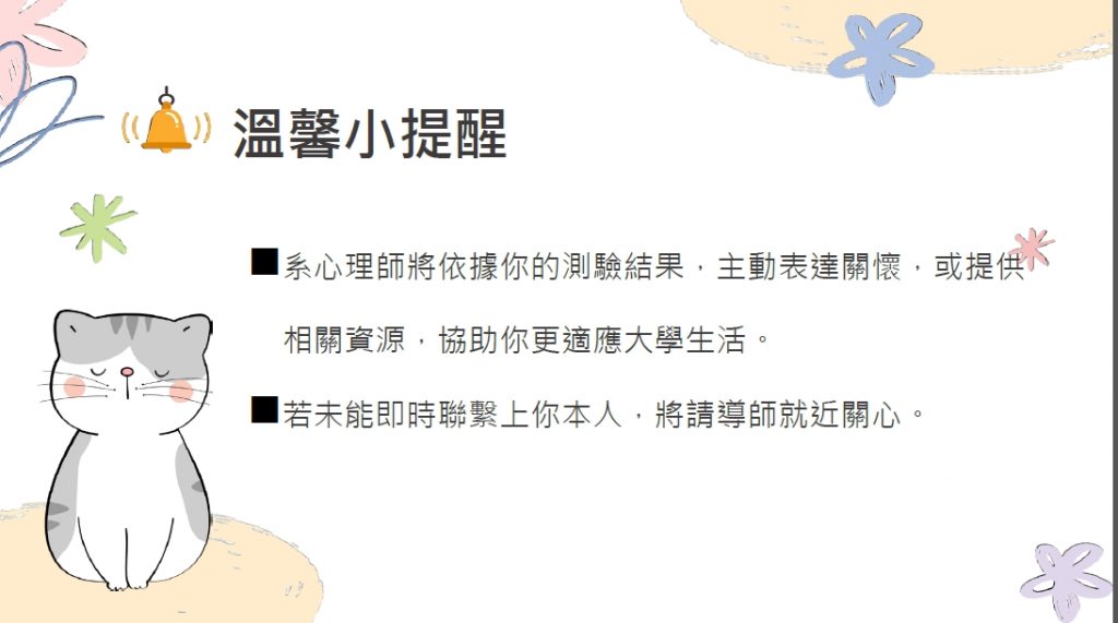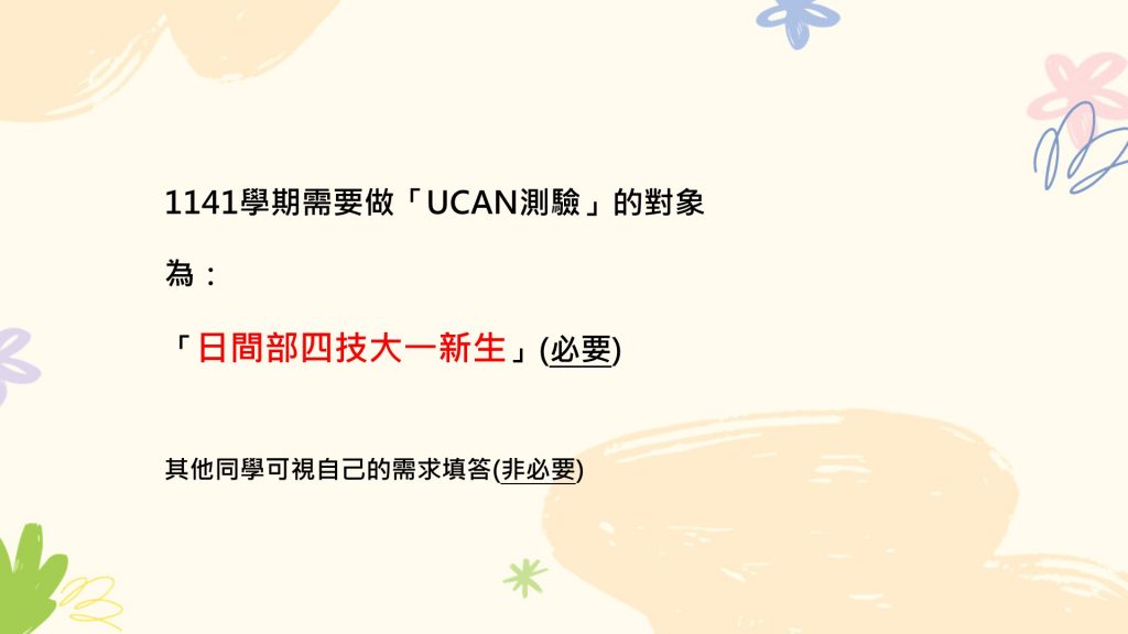 由於新生皆須進行「大專院校學生心理健康關懷量表」及「UCAN」的測驗,若9/1新生啟航未到,且未參加到先前兩場補測,或未施測完全部測驗的同學,請參考以下連結及說明,自行進行測驗。