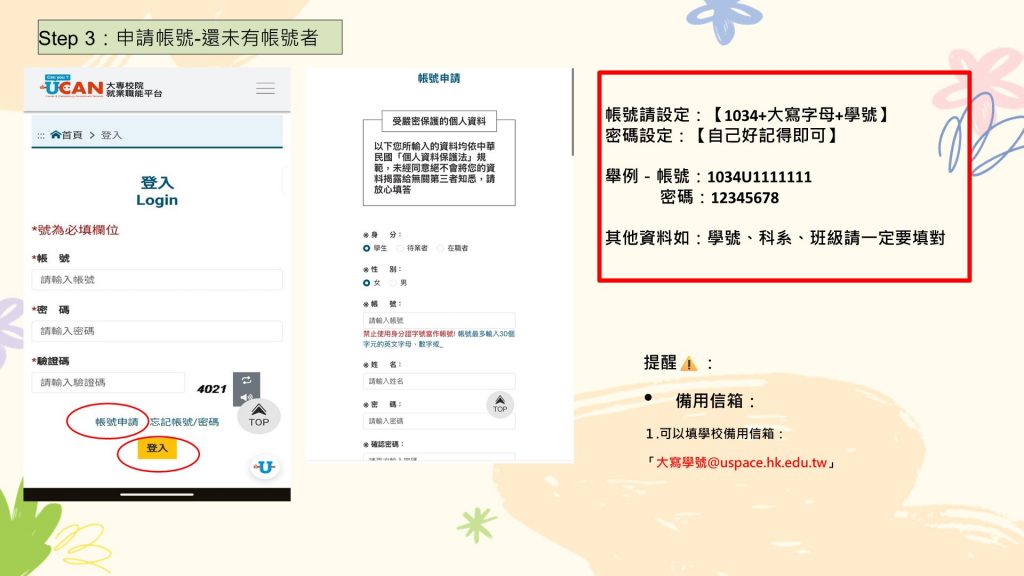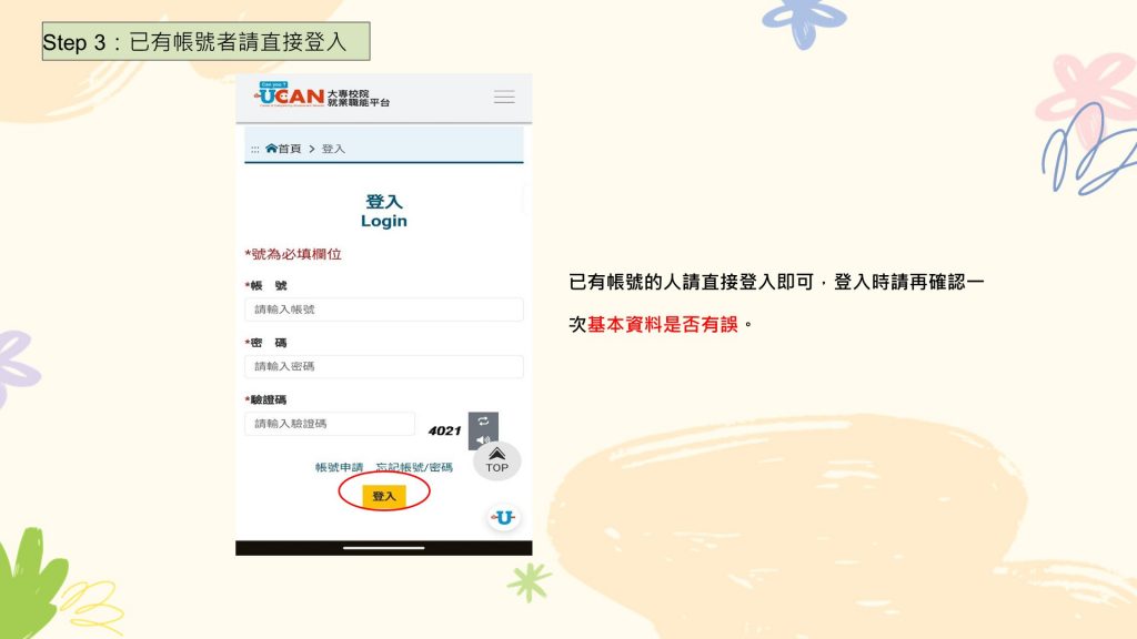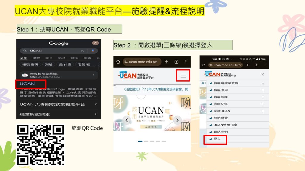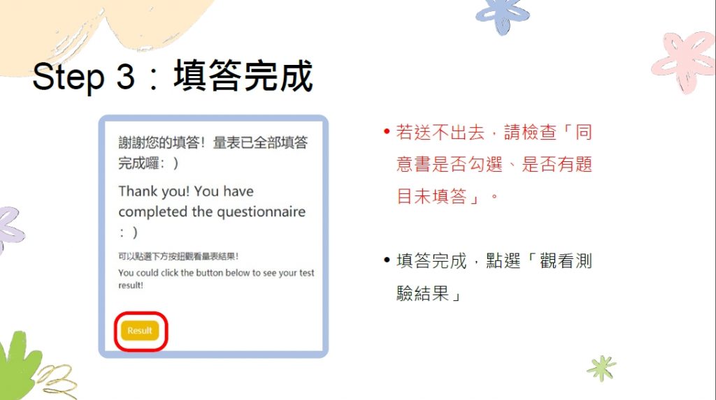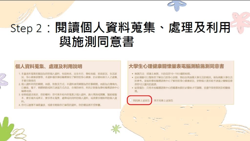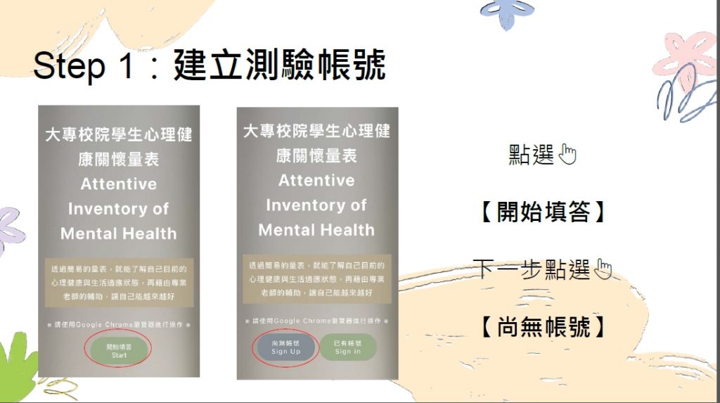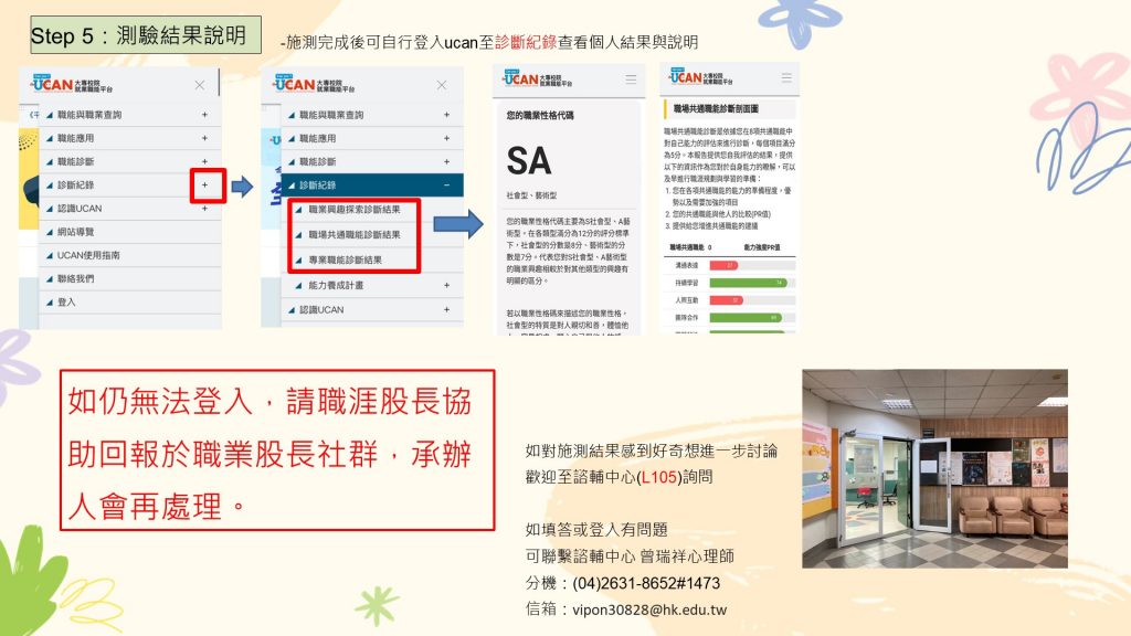 登入程序請看清楚流程後依照流程走,有登入困難、忘記帳號密碼、不知如何操作、不確定是否已經施測、想要聆聽解釋,或有任何問題,都歡迎來電諮輔中心的以珊老師、瑞祥老師,電話:04-26318652,分機1477、1473,或親自到L105諮輔中心找我們協助,謝謝。